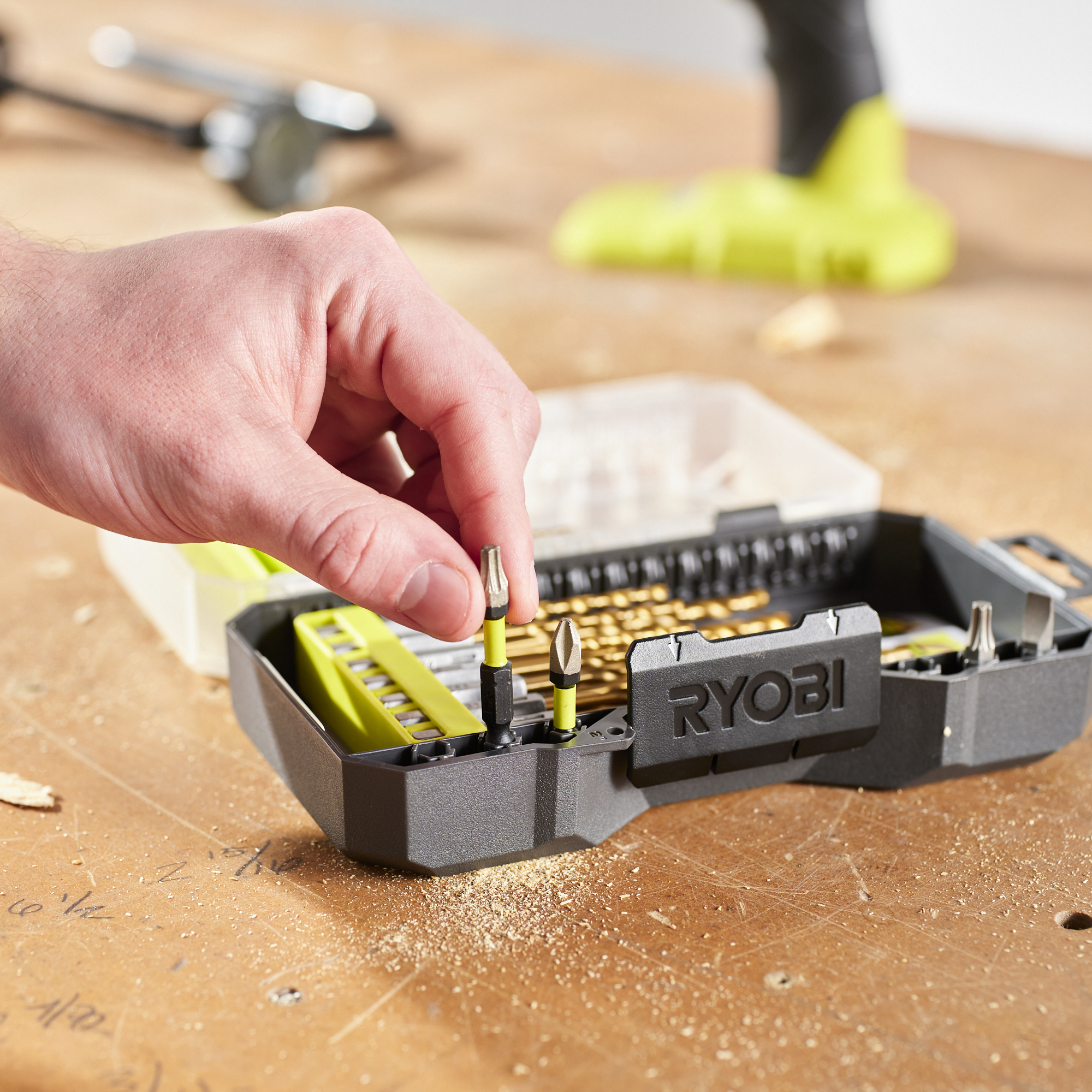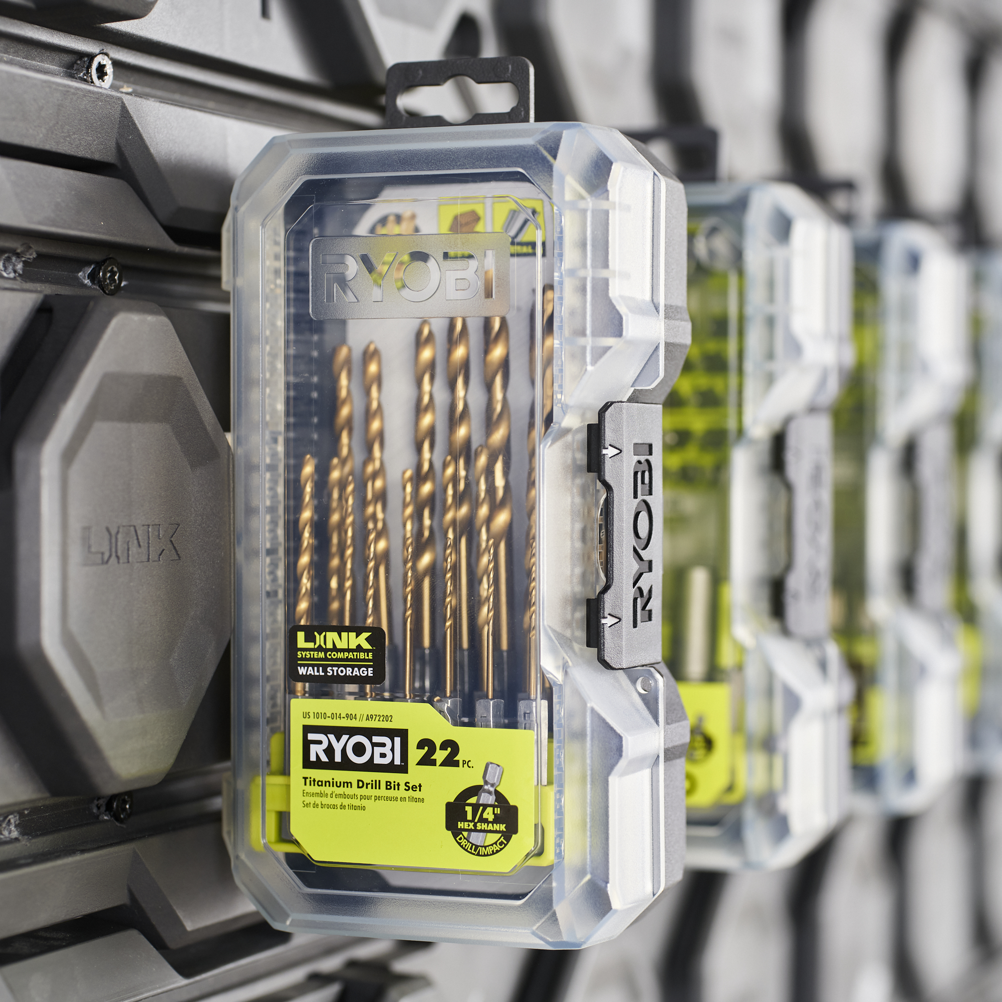 Complement your drilling solutions with the RYOBI 22 PC. Titanium Drill Bit Set, perfect for all of your wood, metal and plastic drilling applications. The titanium coating provides durability and extended life, while the 135° split point design prevents walking and drills on contact. With a 1/4" hex shank, these bits are compatible with both drills and impact drivers. The accessory case is LINK Wall Rail compatible for added user convenience when storing your bits, while the clear lid and thoughtfully designed bit bars allow easy identification and quick bit removal and replacement. Additional storage located on the edge of the case accepts 1" and 2" drive bits for easy access. You can also add complementary bits to your case using compatible bit bars for ultimate case customization tailored to your specific project. The RYOBI 22 PC. Titanium Drill Bit Set is compatible with all standard drills and impact drivers and includes (4) 1/16" (1,59 mm), (1) 5/64" (1,98 mm), (2) 3/32" (2,38 mm), (1) 7/64" (2,78 mm), (4) 1/8" (3,18 mm), (1) 9/64" (3,57 mm), (1) 5/32" (3,97 mm), (1) 11/64" (4,37 mm), (2) 3/16" (4,76 mm), (1) 13/64" (5,16 mm), (1) 7/32" (5,56 mm), (1) 1/4" (6,35 mm), (1) 5/16" (7,94 mm), (1) 3/8" (9,53 mm).